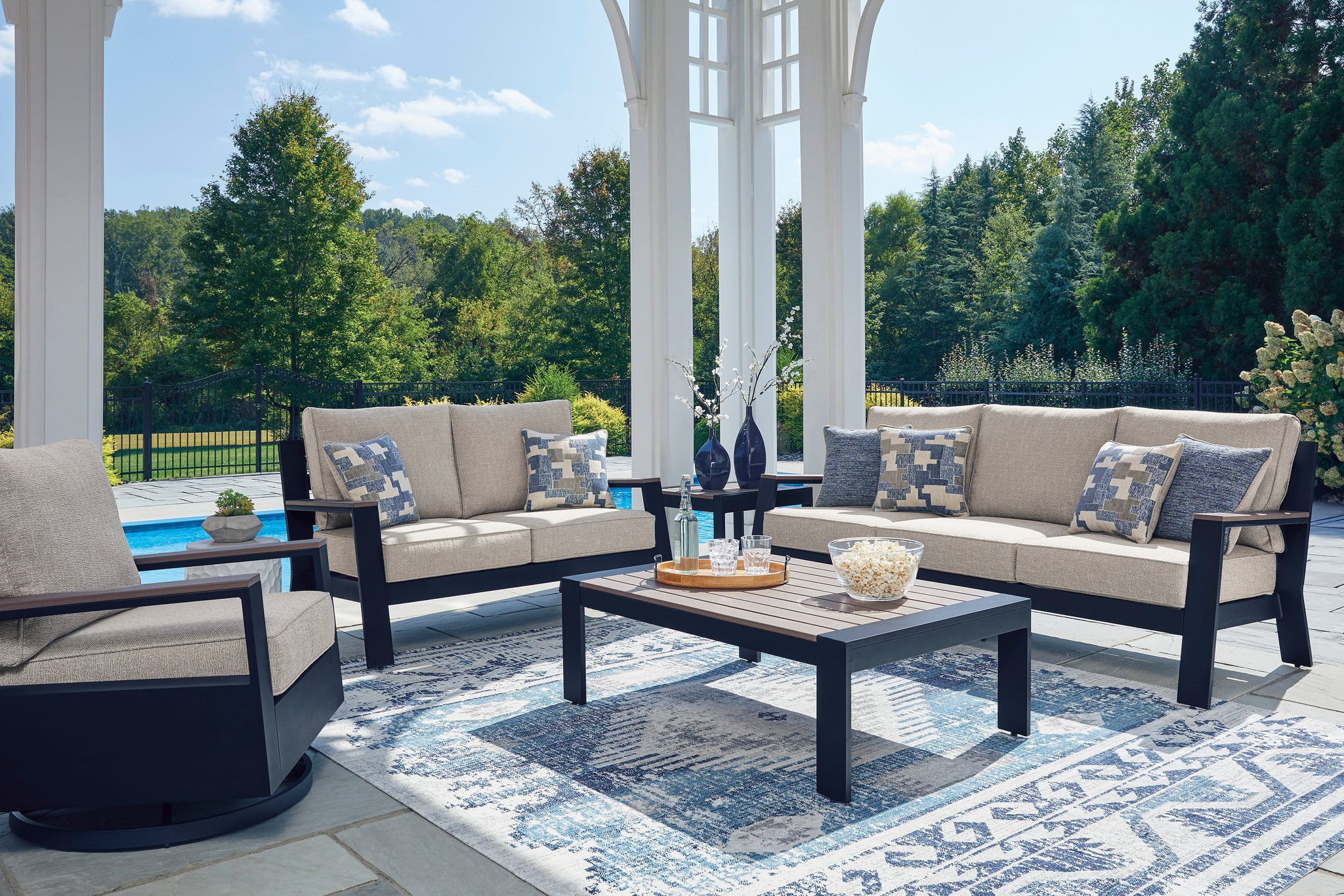 Made with aluminum and durable MEGA-TUFF™ HDPE, for the wood look you love and the weather resistance you crave. Solution-dyed high-performance fabric. Nuvella® is an outdoor fabric that can be cleaned and offers UV resistance. Foam cushion core wrapped in soft polyester. Clean fabric with mild soap and water, let air dry; for stubborn stains, use a solution of 4 oz. bleach to 28 oz. water. Stainless steel hardware resists rust and boosts longevity. Designed to withstand the harsh elements of the outdoors. 4 throw pillows included. Assembly required. Estimated Assembly Time: 30 Minutes