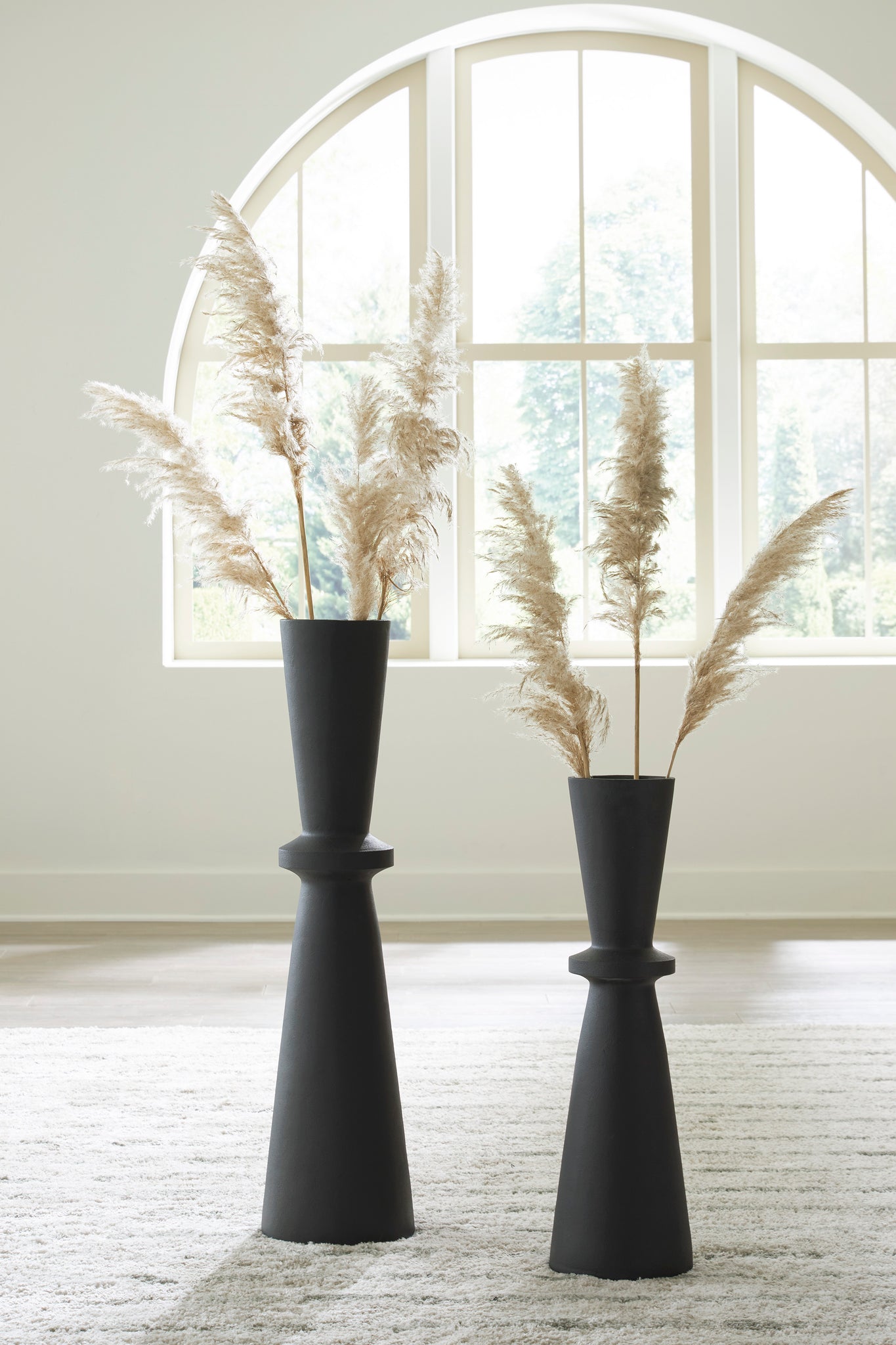 Crafted with contemporary spaces in mind, this black-hued vase is a versatile addition to your indoor or outdoor decor. Its hourglass shape and textured pattern make for an eye-catching standalone piece. Chic in an office corner or greeting guests in the entryway, this vase also acts as a high-style host for floral arrangements.